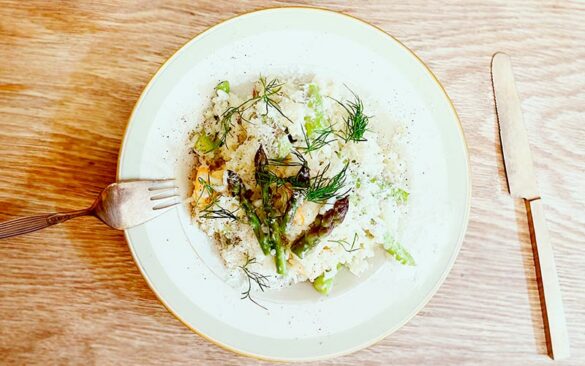Risotto er en fantastisk klassiker fra Italien, der kan laves i mange skønne versioner. Her får du opskriften på en forårsudgave med grønne asparges, friske rejer og krydderurter. Hemmeligheden bag en vellykket risotto er at ramme den rette konsistens. Carnaroli risottoris er kendt som kongen af risotto, fordi sorten er fantastisk til at absorbere væde og smag fra de øvrige ingredienser under tilberedningen, og dermed får du nemt den rigtige cremede konsistens.