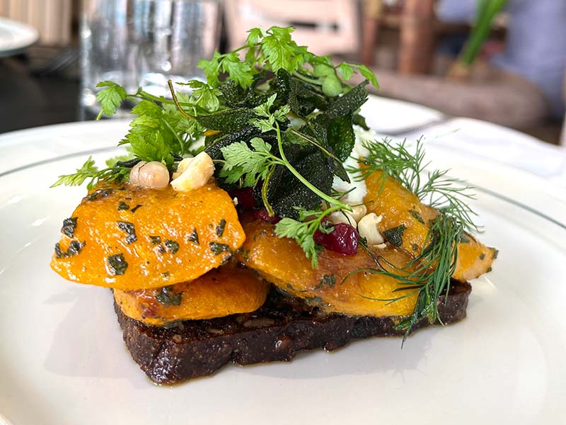 Kombinationen var næsten poetisk – med sødme fra græskarret, fedme og styrke fra skimmelosten, syre fra bærrene, aromatisk bitterhed fra salvien og crunch fra de ristede hasselnødder. Alt var afstemt, og hver eneste mundfuld smagte af efterår, fyldt med sæsonens karakteristiske nuancer. Et lille mesterværk på rugbrød.