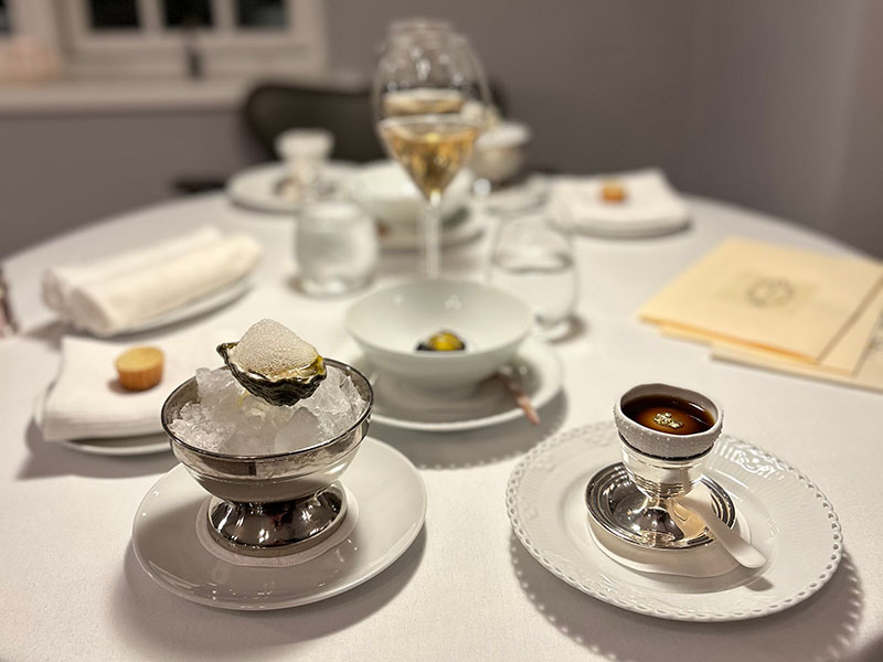 Middagen indledes med fire små mesterværker: Østers med passionfrugt og ingefær. Blåfinnet tun med vagtelæg og Gastro Unika Supreme Baerii Caviar. Sort hummer og safran consommé samt en croustade med 36 måneders modnet Comté. Hver servering var kraftfuld, elegant og præcis. Dertil fik vi et glas NV Le Réserve Billecart Salmon Champagne, som fuldendte oplevelsen.