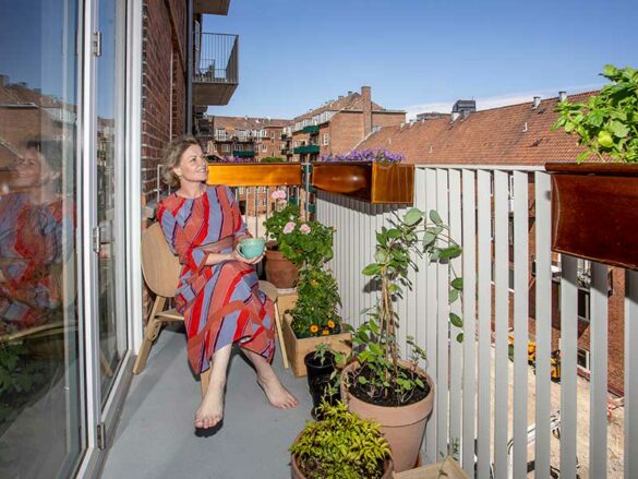 Da andelsforeningen vedtog at etablere altaner, fik alle andelshavere mulighed for at få én altan, og da hun har tre andele, blev det til tre altaner. ”Jeg er meget begejstret for, at vi fik altaner, men tænkte lige i starten, at tre måske er i overkanten. For når jeg har en altan, skal den indrettes ordentligt. Tendensen med, at den bliver et opbevaringssted for en kasse sodavand eller cykel, er ikke noget for mig. Men nu det virkeligt dejligt med de tre små uderum,” siger Marie. Hun har to altaner ud mod gaden og en mindre ind mod gården. Marie har sat sig for, at hun blandt andet skal have en masse forskellige planter på altanerne, så hun kan sanse deres dufte, nyde blomsterne og slappe af i de små grønne oaser. ”Jeg fandt hurtigt ud af, at det er enormt omfattende at etablere de små altanhaver. Jeg er født på Rigshospitalet, vokset op på Sølvgade og bor i dag på Strandboulevarden, så jeg har boet i byen hele mit liv. Så jeg har aldrig haft en have og ved ikke ret meget om det. Men for pokker, det kræver tid at sætte sig ind i kapilær-kasser, selvvandingssystemer, rodnet, forskellige former for jord osv. Jeg meldte mig ind i alle mulige former for facebookgrupper for at blive klogere, men du kan altså ikke lære af folk, der har have, da det er noget helt andet end en altan med planter. Men det er sjovt, hvis man interesser sig for det.”