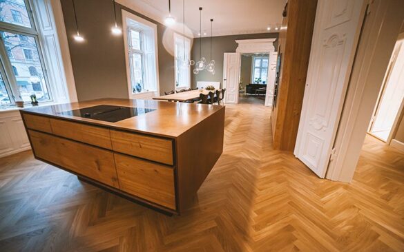 Allé finder vi den klassiske herskabslejlighed på 220 m2 i en bygning, som oprindeligt er opført i 1882. Lejligheden er netop i sat i stand fra gulv til loft med stor respekt for det oprindelige materialevalg. Alle gulve er lagt af Kastrup Gulve i form af eksklusivt sildebensparket i egetræ, et holdbart og klassisk gulv, der igen vinder frem i popularitet, men som kræver det ypperste af gulvlæggeren for at komme til at fremstå perfekt.