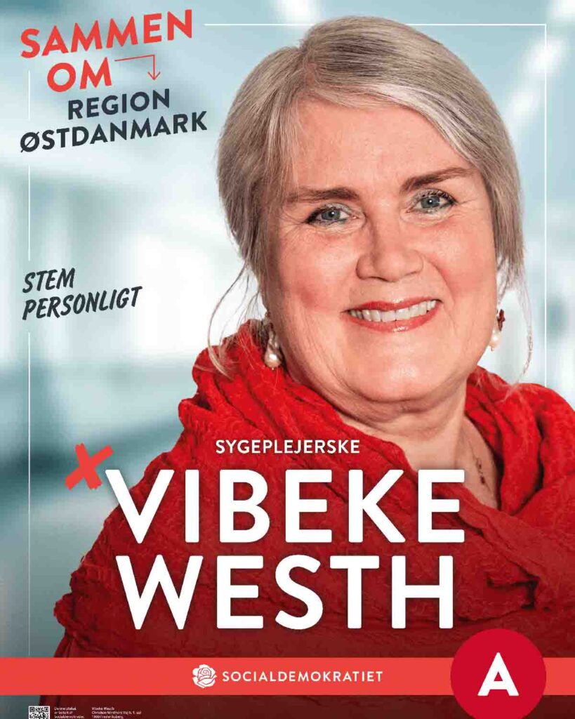 Vibeke Westh fra Socialdemokratiet stiller op til både Region Østdanmark og Frederiksberg ommunalbestyrelsen. Hun er sygeplejerske, regionsråds-medlem og forkvinde for en NGO, der arbejder for børn og kvinders rettigheder. Hendes mærkesager er et sundhedsvæsen tæt på borgerne, mindre ulighed i sundhed og bedre rammer for medarbejderne.Samtidig med at der den 18. november er valg til Borgerrepræsentanten i København er der Regionalvalg til den nye Region Østdanmark. En af kandidaterne er socialdemokraten Vibeke:
