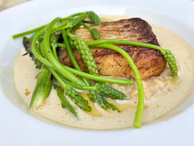 Til hovedret nød vi først stegt helleflynder med grønne og vilde asparges, perfekt tilberedt risotto og en forførende sauce vin blanc. Dernæst fulgte en saftig poussin (ungkylling) med spidskål, farseret morkel og den klassiske sauce périgueux – rig på trøffel og dybde. En ret, der smagte af det absolut bedste, Frankrig har at byde på – og af køkkenets ubestridelige håndværk.