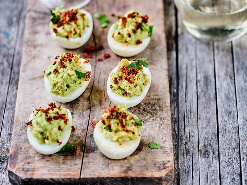 Uanset navnet er ideen den samme: Hårdkogte halverede æg fyldes med lækkert fyld rørt op med æggeblommerne. I denne version røres æggeblommerne op med avocado, lime og god olivenolie.