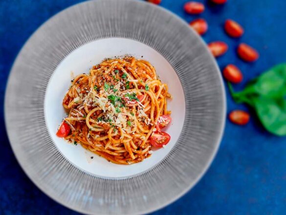 Pasta All Arrabbiata er en simpel og elsket pastaklassiker, der kan varieres på mange måder. Denne version får ekstra cremet tomatsauce med lidt græsk yoghurt og ekstra nærende proteiner med hvide bønner. Top med revet parmesan, lidt krydderurter og god ekstra jomfru olivenolie.